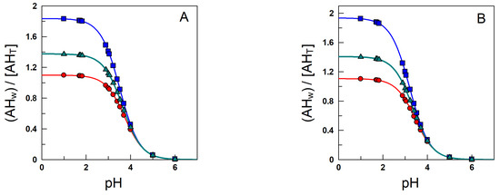 Equation (6) predicts that the variation of PWO (app) with the acidity is sigmoidal, as shown in Figure 8A,C. Note that with the limit of low pH (pH at least two units below the pKa of the ionizable antioxidant), the apparent partition coefficient approaches that of the neutral form, PWO, because [H+] >>> Ka. Thus, the upper limit value of PWO (app) is that corresponding to the neutral molecule (PWO).