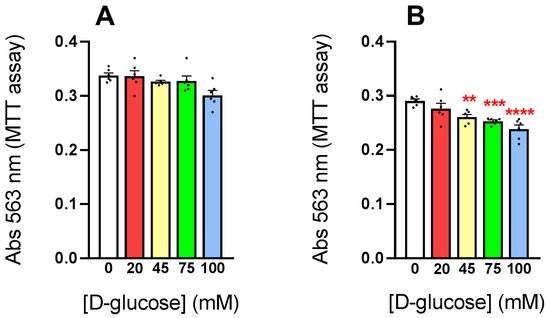 Effect of high glucose exposure on HLE cells’ viability. HLE cells were grown as described in Section 2.2 and maintained for 24 h (A) and 48 h (B) in MEM supplemented with the indicated D-glucose concentrations. Cell viability was evaluated as described in Section 2.3. All values are reported as the mean ± SEM of six independent measurements. Statistical analysis was performed using one-way ANOVA with Tukey post hoc test. Significance was evaluated with respect to cells incubated in MEM alone (**: p < 0.01; ***: p < 0.001; ****: p < 0.0001).