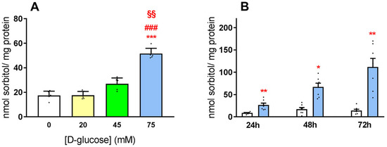 Intracellular sorbitol accumulation in HLE cells exposed to high glucose conditions. Intracellular sorbitol content was fluorimetrically measured, as described in Section 2.6. (A) HLE cells were grown for 48 h in MEM supplemented with the indicated D-glucose concentrations. Values are reported as the mean ± SEM of six independent measurements. Statistical analysis was performed using one-way ANOVA with Tukey post hoc test. Significance of the 75 mM D-glucose treatment was evaluated with respect to the following conditions: no treatment: *; 20 mM D-glucose treatment: #; 45 mM D-glucose treatment: §. (§§: p < 0.01 value; ***, ###: p < 0.001). (B) Cells were incubated for the indicated times in MEM alone (white bars) or supplemented with 75 mM D-glucose (blue). Values are reported as the mean ± SEM of seven independent measurements. Statistical analysis was performed using Student’s t-test. Significance was evaluated with respect to untreated cells incubated for the same time (*: p< 0.05; **: p < 0.01).