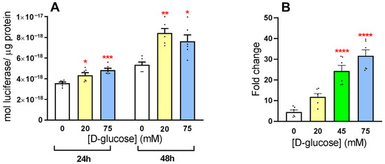 As detailed in the Introduction, high glucose exposure has been widely considered a stimulus able to induce an inflammatory response, which, depending on the cell system adopted, has been linked to the expression of several different markers. Here, we selected the activation of NF-κB, which in our cell system was linked to Firefly luciferase expression (see Section 2.2), and the expression of COX-2, to evaluate the occurrence of inflammatory phenomena. Indeed, a marked increase in the activation of NF-κB was observed upon 24 and 48 h exposure of HLE cells, both to 20 and 75 mM D-glucose (Figure 3A); NF-κB activation was also significant after 16 h of exposure to 20 mM D-glucose. In addition, COX-2 expression was significantly enhanced upon exposure to high glucose conditions (Figure 3B); the expression of the inflammatory marker in the presence of the highest D-glucose concentration tested, was approximately six times the basal value. For both inflammatory markers, our results indicated that inflammation is induced by a stimulus whose entity did not appear sufficient to determine a significant sorbitol accumulation. In fact, a significant increase in NF-κB and COX-2 expression was observed upon treatment with D-glucose concentrations as low as 20 and 45 mM, respectively.