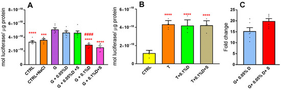 Effect of AKR1B1 inhibition on inflammatory response. (A) The expression of NF-κB, reported as mol of luciferase/mg of protein, was measured through luminometric detection (see Section 2.4) after 24 h. CTRL and CTRL + NaCl refer to cells grown in MEM alone or supplemented with 14.4 mM NaCl, respectively. Different letters refer to the following addition to MEM: G, 75 mM D-glucose; D, DMSO; S, 50 μM sorbinil. Values are reported as the mean ± SEM of six independent measurements. Statistical analysis was performed using one-way ANOVA with Tukey post hoc test. Significance was evaluated with respect to G (***: p < 0.001; ****: p < 0.0001) or with respect to G + 0.05%D (####: p < 0.0001). (B) The expression of NF-κB, reported as mol of luciferase/mg of protein, was measured through luminometric detection (see Section 2.4) after 24 h. CTRL refers to cells grown in MEM containing 175 ng/mL human serum albumin. Different letters refer to the following addition to CTRL: T, 0.2 nM TNF-α; D, DMSO; S: 100 μM sorbinil. Values are reported as the mean ± SEM of six independent measurements. Statistical analysis was performed using one-way ANOVA with Tukey post hoc test. Significance was evaluated with respect to CTRL (****: p < 0.0001). (C) The expression of COX-2 was measured through Western blot (see Section 2.7) 48 h after the addition of glucose. G: 75 mM D-glucose; D: DMSO; S: 100 μM sorbinil. For each condition, data are reported as fold change with respect to expression values measured at time zero of incubation. Values are reported as the mean ± SEM of four independent measurements. Statistical analysis was performed using Student’s t-test.