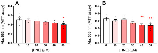 Effect of HNE on HLE cell viability. HLE cells were grown as described in Section 2.2 and maintained in MEM in the presence of the indicated HNE concentrations for 6 h (A) and 24 h (B). Cell viability was evaluated as described in Section 2.3. All values are reported as the mean ± SEM of six independent measurements. Statistical analysis was performed using one-way ANOVA with Tukey post hoc test. Significance was evaluated with respect to untreated cells (*: p < 0.05; **: p < 0.01).