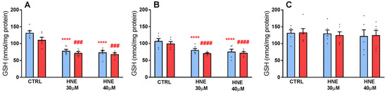 Effect of HNE incubation on intracellular glutathione content. GSH (blue bars) and total glutathione (red bars) levels were measured as described in Section 2.8, by HPCE analysis, in crude extracts obtained from HLE cells incubated for 30 min (A), 1 h (B), and 3 h (C), in the presence of the indicated HNE concentrations. Results are expressed as mean ± SEM of six independent experiments. Significance was evaluated with respect to GSH value (*) or total glutathione value (#) of control cells incubated in the absence of the aldehyde (CTRL bars), using one-way ANOVA followed by Tukey post hoc test (###: p <0.001, ****, ####: p <0.0001).