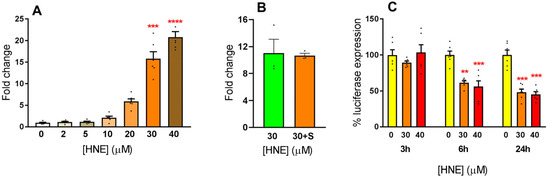 Inflammatory response to HNE treatment. (A) HLE cells were incubated in the presence of the indicated HNE concentrations and COX-2 expression was measured after 6 h, as described in Section 2.7. Values are the mean ± SEM of six independent measurements. Statistical analysis was performed through one-way ANOVA followed by Tukey post hoc test; significance was evaluated with respect to untreated cells (***: p ≤ 0.001 ****: p ≤ 0.0001) (B) HLE cells were incubated in the presence of the indicated HNE concentration, alone or in the presence of 50 μM sorbinil (S). Statistical analysis was performed using Student’s t-test. (C) NF-κB activation was evaluated after the indicated times of exposure to HNE and reported as % of luciferase expression measured for untreated cells. Values are the mean ± SEM of six independent measurements. Statistical analysis was performed through one-way ANOVA followed by Tukey post hoc test; significance was evaluated with respect of untreated cells at each time of exposure (**: p < 0.01; ***: p ≤ 0.001).