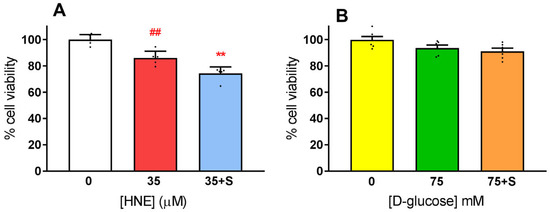Effect of AKR1B1 inhibition on cell viability of HLE cells undergoing different stress. HLE cells were grown as described in Section 2.2; cell viability was evaluated as described in Section 2.3, and expressed as % with respect to the value measured for untreated cells. (A) HLE cells were maintained for 6 h in MEM containing 0.05% DMSO, in the presence of the indicated HNE concentration. S refers to the addition of 10 µM sorbinil. Values are the mean ± SEM of six independent measurements. Statistical analysis was performed using one-way ANOVA with Tukey post hoc test. Significance was evaluated with respect to untreated cells (##: p < 0.01), or with respect to cells incubated with 35 µM HNE (**: p < 0.01). (B) HLE cells were maintained for 24 h in MEM containing 0.05% DMSO, in the presence of the indicated D-glucose concentration. S refers to the addition of 10 µM sorbinil. Values are the mean ± SEM of six independent measurements. Statistical analysis was performed using one-way ANOVA with Tukey post hoc test. Significance was evaluated with respect to untreated cells.