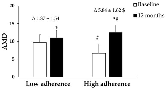Adherence to Mediterranean Dietary (AMD) expressed as points obtained in the questionnaire. Results are presented as mean ± SD. Two-way analysis of co-variance (ANCOVA) after adjustments by the intervention (diet and physical activity). AMD × T interaction between adherence to the Mediterranean Diet and time. * Difference in means between participants in time (baseline and 12 months). # Difference in means between groups (low adherence and high adherence). t-test for unpaired data in the differential values. $ Difference in means according to the differential (12-month values minus baseline values). Data points are significant when p < 0.05.
