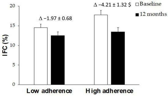 Percentage of IFC in patients with NAFLD at ‘Baseline’ and ‘12 months’ stratified by AMD. Results are presented as mean ± SD. Two-way analysis of co-variance (ANCOVA) after adjustments by intervention (diet and physical activity). AMD × T interaction between adherence to the Mediterranean Diet and time. t-test for unpaired data in the differential values. $ Difference in means according to the differential (12-month values minus baseline values). Data points are significant when p < 0.05.