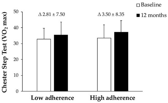 Figure 3 shows IFC levels at baseline and after 12 months of a nutritional intervention. The group that manages to adhere better to this diet achieved a significant decrease in the fat content in their liver, whereas no statistical differences were found in the group with lower adherence. The results of VO2 max in CST were represented in Figure 4. The obtained data reported an improvement in both groups after 12 months, although only significantly in the group with high AMD.