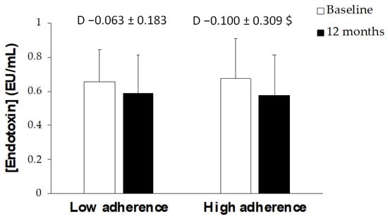 Figure 5 shows endotoxin concentration at baseline and after 12 months of intervention. The group which achieved a higher adherence to the Mediterranean diet presented a greater reduction in endotoxin levels than the group with a lower adherence improvement.