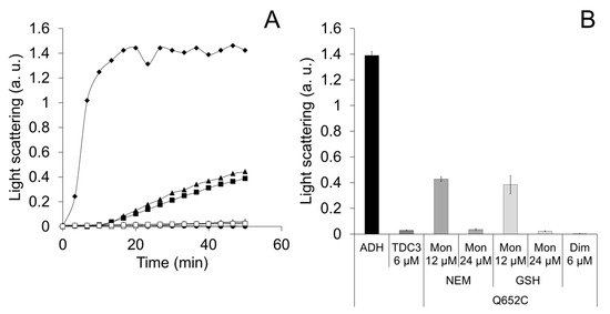 Unfolding activity of a TDC3Q652C dimer and its derivatized monomer with either NEM or GSH. (A) Light-scattering representative traces of ADH denaturing by incubation at 45 °C in the presence of TDC3 variants. ADH with BSA (6 µM) (control) (closed rhomboids), TDC3 (6 µM) (open squares), TDC3Q652C disulfide dimer (6 µM) (closed squares), NEM-derivatized TDC3Q652C monomer (12 µM) (close triangles), NEM-derivatized TDC3Q652C monomer (24 µM) (open triangles), glutathione-derivatized TDC3Q652C monomer (12 µM) (closed circles), and glutathione-derivatized TDC3Q652C monomer (24 µM) (open circles). (B) Average of three independent assays determined after 50 min.
