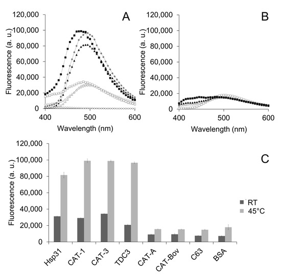 Hydrophobic regions at the CT are exposed by temperature. (A) Fluorescence of the bis-ANS (1.2 µM) when it binds to the hydrophobic zones of the protein surface. CAT-1, CAT-3, and TDC3, together with the Hsp31 (each at 0.8 µM) presented fluorescence at RT which increased 3-fold when incubated at 45 °C for 30 min. Hsp31 (open triangles at RT; closed triangles at 45 °C), CAT-3 (open squares at RT; closed squares at 45 °C), and TDC3 (open rhomboids at RT; closed rhomboids at 45 °C). (B) The SSC CAT-A and BSA showed a low fluorescence and a small increase with temperature. CAT-A (open squares at RT; closed squares at 45 °C) and BSA (open triangles at RT, closed triangles at 45 °C). (C) Average of highest values of three independent experiments.