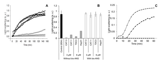 Proteins treated with the bis-ANS probe lost the ability to inhibit heat denaturation of ADH. (A) Light scattering of ADH (6 µM) when heat denatured (45 °C) in the presence of chaperones with the bis-ANS incorporated covalently. Hsp31, CAT-1, CAT-3, and TDC3 (3 and 6 µM) were incubated with bis-ANS (1.2 µM) at 45 °C for 30 min and thereafter irradiated with UV light (366 nm) for 10 min at RT. ADH with BSA (6 µM) (closed circles), CAT-3 (3 µM) without bis-ANS (open circles), CAT-3 (3 µM) with incorporated bis-ANS (closed triangles); TDC3 (6 µM) without bis-ANS (open squares), TDC3 (6 µM) with incorporated bis-ANS (closed rhomboids); Hsp31 (6 µM) without bis-ANS (open triangles), and Hsp31 (6 µM) with incorporated bis-ANS (closed squares). (B) Average of three independent assays. (C) Light scattering of ADH (6 µM) when denatured at 45 °C for 150 min in the presence of BSA (6 µM) (rhomboids), TDC3 (6 µM) (triangles), and TDC3 (6 µM) but adding bis-ANS (1.2 µM) 10 min after starting the reaction (indicated by arrow) (squares). To avoid photo-incorporation of the bis-ANS probe, light scattering was determined at 500 nm in this assay.