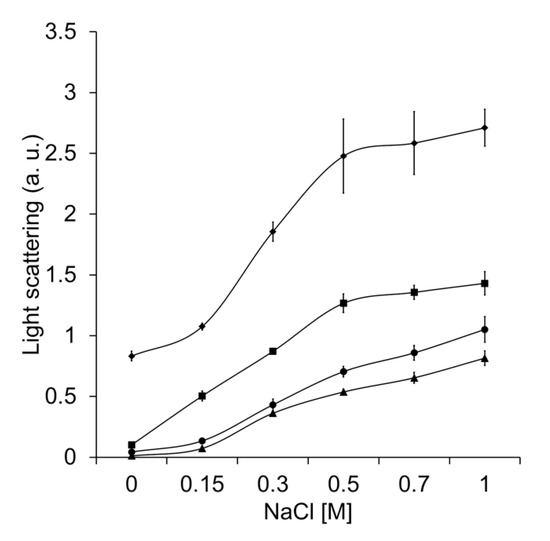 Increased ionic force (NaCl concentration) partially impaired unfolding activity. Heat denaturation of ADH (6 µM), measured by light scattering at 360 nm, in the presence of BSA (6 µM) (rhomboids), Hsp31 (6 µM) (squares), CAT-3 (3 µM) (triangles), and TDC3 (6 µM) (circles) at different NaCl concentrations (0, 0.15, 0.3, 0.5, 0.7, and 1 M) in 10 mM phosphate buffer, pH 7.8. Average of the final light-scattering value from three independent experiments.