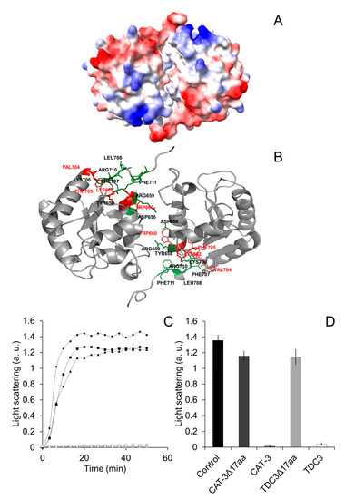 Determination of the amino acid residues in the TDC3 surface that could interact with the substrate proteins. (A) Surface representation of the TDC3 dimer with the electrostatic potentials calculated by UCSF Chimera between −10 kcal/mole (red) and +10 kcal/mole (blue). (B) Using the InterProSurf server [41], a prediction of the zones of the TDC3 dimer that could interact with other proteins was obtained. Amino acid residues with the highest probability of interaction are highlighted in red (W660, K662, V704, and F705) and those with medium probability are marked in green (D656, Y658, R659, K706, F707, R710, and F711). (C) Representative traces for ADH (6 µM) heat denaturation, determined by light scattering at 360 nm, at 50 °C for 50 min, in the presence of: BSA (6 µM) (rhomboids), CAT-3 (3 µM) (open triangles), TDC3 (6 µM) (open squares), CAT-3Δ17aa (3 µM) (filled triangles), and TDC3Δ17aa (6 µM) (filled squares). (D) Average of the final light-scattering value from three independent experiments.