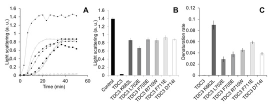 To determine which of these amino acid residues participate in the unfolding activity of the TDC3 dimer, we substituted some residues—hydrophobic for charged and charged for hydrophobic. To select substitutions that had a less disturbing effect on the conformation of the domain a theoretical analysis was done using the server Duet [42]. All substitutions showed a clear effect on the TDC3 unfolding activity, between 43 and 50% of the control activity (Figure 6A,B). However, it was possible to distinguish differences in their denaturation rates; rate was relatively fast for the K662L variant (maximal activity in 20 min), intermediate for R710W and F711E (maximal activity at 30 min), and slow for L702E, F705E, and D714I variants (maximal activity at 35–40 min) (Figure 6A,C). Near-UV spectra showed similar amounts of alpha helices in all TDC3 variants with the exception of TDC3D714 which had more beta strands and fewer unstructured regions (Figure S2A).