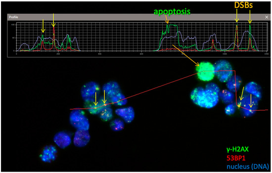 DSB focus analysis in HOB cells via γH2AX+53BP1-positive DNA DSB foci detection. The upper part of the image shows intensity profiles along the red line below across 6 nuclei (DNA, blue). γH2AX-positive foci are shown in green, 53BP1 in red. Colocalized foci are a surrogate marker for DSBs and are marked with yellow arrows. Apoptosis can be seen as pan-nuclear γH2AX staining in absence of 53BP1.