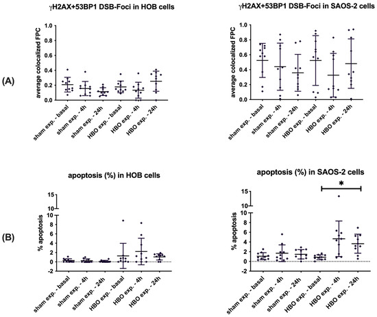 Detection of γH2AX+53BP1 double-strand break foci (A) and apoptosis (B) in HOB and SAOS-2 cells after exposure to hyperbaric oxygen (HBO exposure) and ambient air (sham exposure). Data are presented as mean ± SD; p-value: * p < 0.05.
