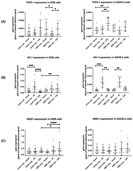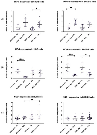 Gene expression of TGFß-1 (A), HO-1 (B), and NQO1 (C) in HOB and SAOS-2 cells after exposure to hyperbaric oxygen (HBO exposure) and ambient air (sham exposure). Data are presented as mean ± SD; p-values: * p < 0.05, ** p < 0.01, *** p < 0.001, **** p < 0.0001.