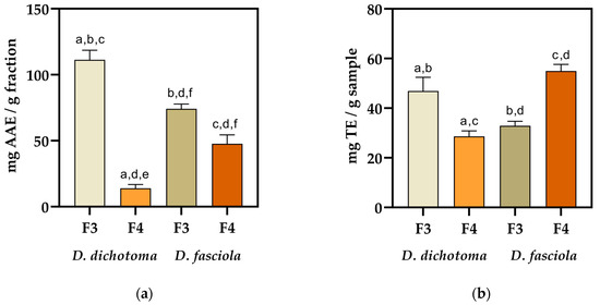 Radical scavenging effect of D. dichotoma and D. fasciola F3 and F4 fractions using (a) 2,2-diphenyl-1-picryl-hydrazyl-hydrate (DPPH), (b) reduction of radical cation (ABTS), (c) oxygen radical absorbance capacity (ORAC), and (d) ferric reducing antioxidant power (FRAP) in vitro assays (mean ± SD; n = 3). Common letters indicate a significant difference between the fractions (p < 0.05).