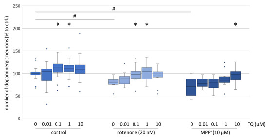 Effects of TQ on the number of THir (dopaminergic) neurons in rotenone- or MPP+-affected primary mesencephalic cultures after 48 h treatment. Specifically, 100% corresponds to the number of dopaminergic neurons in the untreated controls (0 µM TQ, 0 nM rotenone, 0 µM MPP+). The data represent at least five independent experiments. Statistically significant differences between the TQ groups compared to the respective controls were determined using the Kruskal–Wallis (H) test followed by the χ2 test (* p < 0.05). The Mann–Whitney (U) test was used to evaluate the effects of rotenone/MPP+ vs. the control (# p < 0.05).