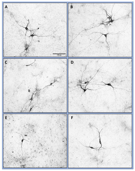 Representative photographs of the THir neurons under different conditions. (A) Neurons in the untreated controls (0 µM TQ, 0 nM rotenone, 0 µM MPP+). (B) Neurons treated with 10 µM TQ. (C) Tyrosine hydroxylase positive neurons treated with 10 µM MPP+. (D) Cells concomitantly treated with 10 µM TQ and 10 µM MPP+. (E) Dopaminergic neurons treated with 20 nM rotenone. (F) THir neurons concomitantly treated with 10 µM TQ and 20 nM rotenone.