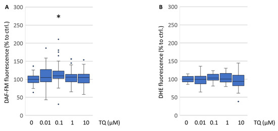NO concentrations (A) and ROS formation (B) of 48 h TQ-treated primary mesencephalic cultures. Untreated control groups were set to 100%. The data represent seven independent experiments. Statistically significant differences between the TQ groups comoared to the respective controls were determined using the Kruskal–Wallis (H) test followed by the χ2 test (* p < 0.05).