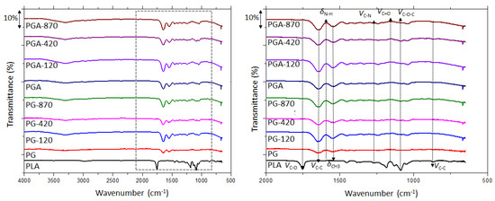 FTIR spectra of PLA and coated films. Left: Zoom of the fingerprint region showing characteristic bond vibrations in 500–2000 cm−1. PLA, poly(lactic) acid; PG, PLA-gelatin; PGA, PLA-gelatin-gallic acid.