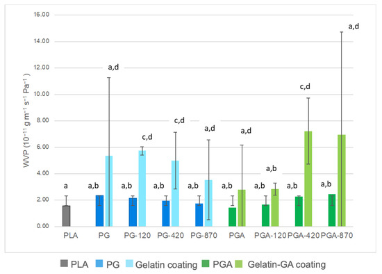 Measured WVP of PLA and coated PLA samples (gelatin side exposed to RH 30%, PLA side to RH 75%, (a,b,c,d Mean values with the same superscript letter are not significantly different from each other (p > 0.05 ANOVA followed by the Tukey test).