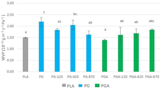 The measured values of the water vapor permeability (WVP) for the PLA, the PLA/gelatin, and the PLA/gelatin-GA films, both untreated and corona treated, and those calculated from a series resistance model for the coatings alone are presented in Figure 3. Only WVP is discussed and not the WVTR, as WVP normalized the transfer rate by the thickness and partial pressure gradient. The WVP value measured for the PLA is in accordance with the datasheet of the manufacturer, after corrections according to the RH differential were used, as well as in the same order of magnitude to that measured by Shogren [56].