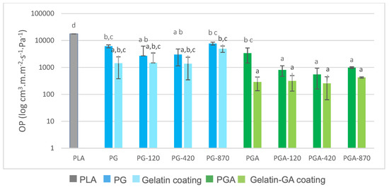 Figure 5 displays the expected OP decrease when the coatings were applied to the PLA. The OP decrease trend continued when comparing the corona-treated formulations with the untreated ones, except for the PG-870 degraded sample. Furthermore, all formulations containing gallic acid showed a significantly lower OP, up to about 100 times, compared to the ones containing only gelatin. Hydrophilic coatings on the PLA often permit several order of magnitudes reduction of the OP, as displayed by Han et al. [59] for chitosan based coatings applied on the PLA film. Indeed, thin layers of chitosan decrease the OP of coated PLA, compared to neat PLA by almost 100 times. The same conclusions have been given for gluten coating laminated onto the PLA that allowed to drop down the OP by 1000 to 10,000 times according to thicknesses [61].