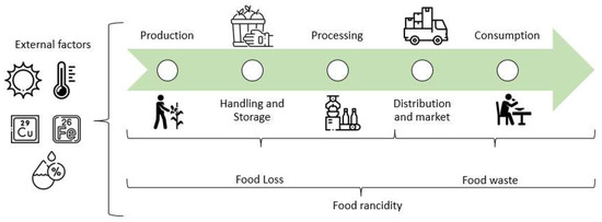 Comparing developed and developing countries shows significant food loss and waste differences. In developed countries, the total amount is 56%, of which 21% is lost, and 35% is wasted. In the case of developing countries, the total is equivalent to 44%, where loss comprises 30%, and waste is 14% [29]. Meanwhile, about 20 million tons of food in Mexico are wasted annually, resulting in economic losses of 400 billion Mexican pesos [31]. Rancidity constitutes one of the causes that lead to food loss and waste, as it can occur during all stages of food production (handling, processing, and storage) (Figure 1) [4]; however, its real impact has not been quantified. To fully understand the impact of rancidity on food loss and waste, specific statistics need to be generated, including the amount of food lost and wasted by rancidity during harvest, processing, and storage [28]. During the production, handling, storage, processing, distribution and market, and home preparation stages of food, various conditions exist that can contribute to lipid oxidation and the development of rancidity [4]. In the early stages of production, high temperatures and exposure to light, air, and trace metals can initiate and accelerate lipid oxidation. During handling and storage, temperature fluctuations and exposure to light, air, and moisture can also contribute to lipid oxidation, while, in processing, high heat and pressure treatment, exposure to oxygen, and the addition of prooxidants such as iron and copper can also lead to lipid oxidation. During distribution and market, improper storage, light exposure, and high temperatures can also contribute to rancidity. Finally, during home preparation, excessive heating and inappropriate cookware can also lead to this problem [4,32].