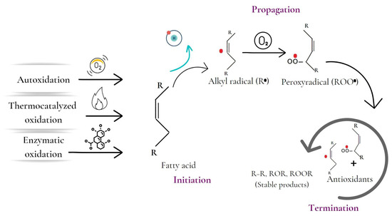 Lipid oxidation has been described through several mechanisms, such as autocatalyzed, thermocatalyzed, enzymatic, and photo-oxidation (Figure 2) [3]. Autoxidation is the most significant process in lipid oxidation and causes oxidative rancidity. The process involves the interaction of unsaturated fatty acids with oxygen, leading to a continuous chain reaction of free radicals [1,3]. The process has three phases: initiation, propagation, and termination. During the initiation phase, hydrogen is extracted from an unsaturated fatty acid, forming an alkyl radical. The propagation phase involves the magnification of radical production, while the termination phase involves the reaction of the radicals with each other or with antioxidants, becoming relatively stable [4]. Autoxidation is influenced by internal and external factors such as fatty acid profile, temperature, light, and prooxidants such as transition metals [3].