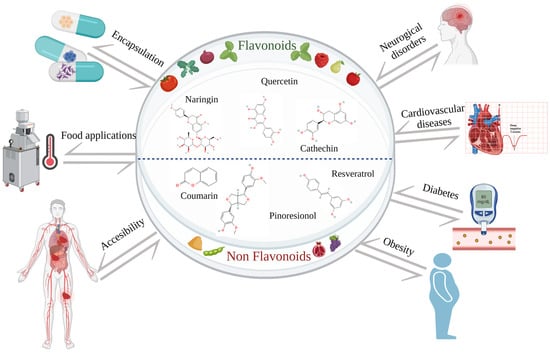 High-quality food with a functional, curative, and beneficial effect on human metabolism is increasingly desired worldwide. In this context, polyphenols which are present in a variety of food, e.g., in fruits and vegetables, tea, coffee, chocolate, whole grains, red wine, food by-products, and wastes [1,2,3,4], have received increasing attention for their positive impact on human health due to their bioactive properties, mainly antioxidant and anti-inflammatory ones [5,6,7,8,9,10]. Plenty of investigations have reported a positive effect from the consumption of polyphenol-rich food on incidences of chronic illnesses such as cardiovascular disease [11], diabetes mellitus [12], and cancer [13]. Furthermore, the anti-microbial and antifungal properties that polyphenols contribute to food items are worthy of being mentioned [9]. Plant-based polyphenols show a high variety of structures and can be classified using a number of schemes into a variety of groups; although the common feature of all phenolic compounds is that they possess an aromatic ring with at least one hydroxyl substituent [6]. The bioavailability (bio-accessibility, absorption, and transportation) of polyphenols for humans is affected by their chemical structures, but also by food matrices, their binding to other molecules, processing techniques used, and the host’s metabolism [14]. An increased understanding of how specific food biotechnologies and processing techniques (thermal treatment, chemical binding, enzymatic treatment, fermentation, and encapsulation) influence the bio-accessibility, bioavailability, and properties of the polyphenols will contribute to novel opportunities and perspectives of their uses. These understandings will lead to new functional foods, ingredients, or additives simultaneously as the increasing demand for health-promoting food is met. Here, we are reviewing the current state-of-the-art and future opportunities for the impact of polyphenols on food characteristics and human health. Furthermore, we elucidate how polyphenols can be utilized in the food industry and for human nutrition by understanding and applying specific and targeted processes.