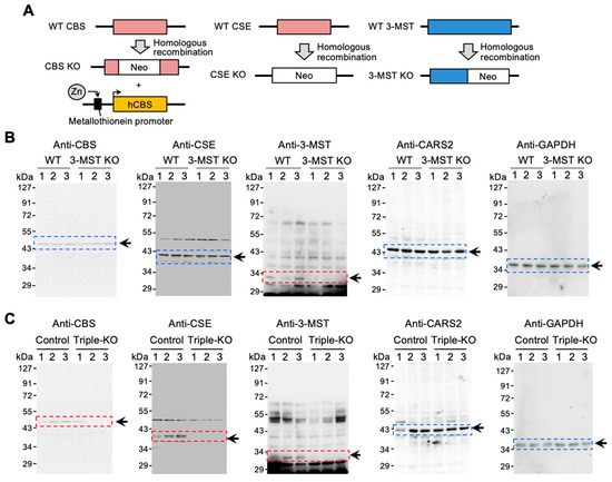 All experimental procedures were conducted according to the Regulations for Animal Experiments and Related Activities at Tohoku University, reviewed by the Institutional Laboratory Animal Care and Use Committee of Tohoku University, and approved by the President of Tohoku University. For the generation of 3-MST KO mice, we inserted a gene trap vector into the first intron of the mouse 3-MST gene in mouse embryonic stem cell lines and generated chimera mice according to the standard protocol [25]. Single-heterozygous CBS mice (Cbs+/−) [26], CSE mice (Cth+/−) [27], and 3-MST mice (Mpst+/−) were mated with each other to produce triple-heterozygous CBS/CSE/3-MST mice. The triple-heterozygous mice were then intercrossed, and CBS/CSE/3-MST triple-KO mice were generated (Figure 1A). Due to the lethality in KO CBS mice, triple-heterozygous KO mice were crossed with human CBS transgenic (Tg-hCBS) mice before the generation of triple-KO mice to avoid lethality in immature mice. The expression of human CBS in Tg-hCBS mice can be activated by supplying zinc water. Therefore, to ensure survivability of the mice to adulthood, zinc water was supplied and then stopped 2 weeks before the experiment [28]. Single CSE KO mice used in Figure S2 are a different strain from the CSE KO mice used to create the triple KO mice [29].