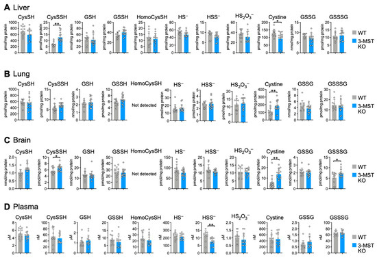 To determine the importance of canonical enzymes in persulfide synthesis, we used sulfur metabolome analysis to study 3-MST KO mice. We first generated 3-MST KO mice by inserting a gene trap vector into an intron in mouse 3-MST; we confirmed the absence of 3-MST protein expression using Western blotting (Figure 1A,B). The expression of CBS, CSE, and CARS2 was unchanged in 3-MST KO mice compared with wild-type mice. (Figure 1B). We therefore quantified CysSSH, GSSH, and other persulfides and their derivatives in liver, lung, and brain tissues and plasma from 3-MST KO mice using LC–MS/MS. We found no significant differences in the synthesis of CysSSH, GSSH, and other persulfides in all the samples that we examined (Figure 2). Although very few results showed some discrepancies, such as the increased level of CysSSH in the liver and the decreased level of HSS– in the plasma, the outcome of this experiment demonstrated that the synthesis of persulfides, including CysSSH, GSSH, and persulfide derivatives, does not depend on 3-MST activity. Section 4 provides a plausible explanation of these discrepancies.