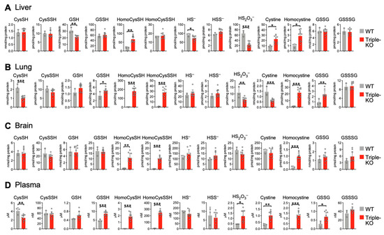 To determine the effects of KO genes in triple-KO mice, we also measured metabolites that are involved in the metabolic pathways for these genes. Since CBS and CSE are a part of the CysSH metabolic pathway [2,33,34], we measured CysSH using LC–MS/MS analysis. We found significantly reduced CysSH metabolite levels in lung tissues (Figure 3B) and plasma (Figure 3D) of triple-KO mice. We expected this finding because disruption of CBS and CSE enzymes reportedly prevented CysSH synthesis (Figure S2) [1,2]. To continue our investigation, we measured homoCysSH, which is an intermediate metabolite in the CysSH synthesis pathway via CBS and CSE, by means of LC–MS/MS analysis in triple-KO mice. We detected significantly elevated levels of homoCysSH in triple-KO mice. We found significantly increased homoCysSSH levels in lung (Figure 3B) and brain (Figure 3C) tissues, as well as in plasma, but not in liver (Figure 3A) tissues of triple-KO mice. Accumulations of homoCysSH may increase the chance of polysulfidation of homoCysSH, which would result in the formation of homoCysSSH [2,5,7,15,35]. Thus, our results for CysSH, homoCysSH, and homoCysSSH were related to the effects of CBS and CSE KO in triple-KO mice.