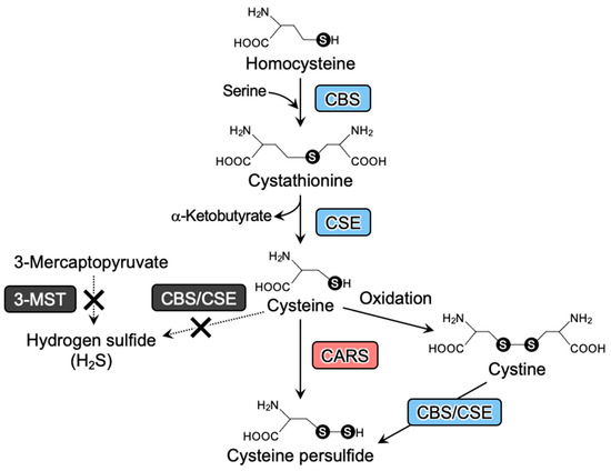 Our current study exploited the novel and elegantly integrated animal model of CBS/CSE/3-MST triple-KO mice, which was, in fact, an efficient tool for investigating the sulfur metabolome, and it demonstrated that all three genes are not vital for CysSSH biosynthesis in vivo under physiological conditions. We also confirmed the primary role of CBS and CSE genes in the CysSH biosynthesis pathway rather than persulfide production. This study may also clarify the predominant role of CARS2/CPERS in the biosynthesis of persulfides and in sulfur metabolism as opposed to the role of three other canonical sulfide/persulfide-generating enzymes—CBS/CSE/3-MST. Moreover, our study may suggest a new study area of sulfur-based redox biology and medicine, in which reactive sulfur species and persulfides are potential therapeutic targets in various diseases that are associated with impaired endogenous persulfide production.