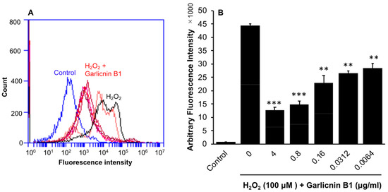 Suppression of intracellular ROS induced by hydrogen peroxide (H2O2) by treatment with garlicnin B1 in the C26 colon cancer cells. The C26 cells were treated by increasing concentrations of garlicnin B1 for 24 h before the addition of H2O2. The amount of intracellular reactive oxygen species (ROS) was then measured using the fluorescence ROS probe DCDHF-DA and analyzed by flow cytometry. (A) shows the histogram of flow cytometry, and (B) shows the quantitative results. Treatment with garlicnin B1 led to a dose-dependent reduction in intracellular ROS levels induced by H2O2. Values are means ± SD; n = 4–8. ** p < 0.01, *** p < 0.001 versus H2O2 alone group. See text for details.