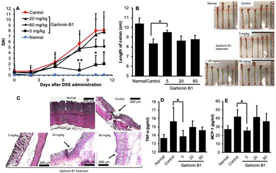 The therapeutic effect of garlicnin B1 on dextran sulfate sodium (DSS)-induced murine colitis was evaluated. The DSS-induced colitis model was established by oral administration of 2% DSS. During the experiment, colitis symptoms were recorded daily to obtain the disease activity index (DAI) values (A). Garlicnin B1 treatment was initiated thrice a week from the 1st day of DSS administration. On day 11, when severe colitis appeared, the mice were sacrificed, the length of the colon was measured (B), and a histological examination of the colon was performed (C). Plasma levels of inflammatory cytokines (TNF-α and MCP-1) were also measured (D,E). The arrows indicate tissue damage in the colon mucosa. Values are presented as means ± standard deviation (SD); n = 6. * p < 0.05, ** p < 0.01. Bar, 200 μm. See text for details.