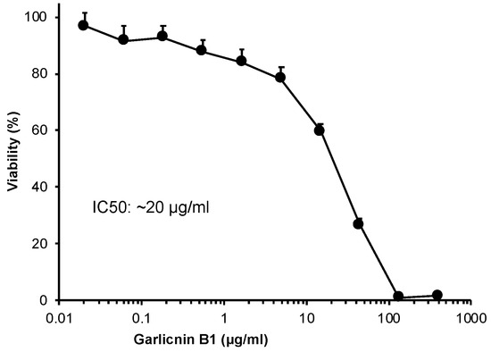 We investigated the cytotoxicity of garlicnin B1 by using mouse C26 colon cancer cells. The cells were cultured in RPMI-1640 containing 10% fetal bovine serum (FBS, Nichirei Biosciences Inc., Tokyo, Japan). The cells were seeded in 96-well plates (3000 cells/well); after overnight preincubation, different concentrations of garlicnin B1 were added to the cells, and the cells were treated for 24 h. The cell viability was then examined by using an MTT assay [23].