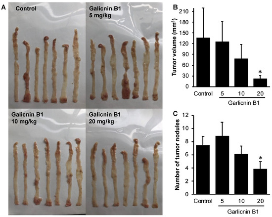 Inhibitory effect of garlicnin B1 on colon carcinogenesis in mice treated by azoxymethane (AOM)/dextran sulfate sodium (DSS). (A) shows representative pictures of the colon from different experimental groups, (B) shows the cumulative size of tumor nodules in each mouse, and (C) shows the average number of tumor nodules in the colon. Values are presented as means ± standard deviation (SD); n = 7. * p < 0.05 versus the untreated control group. See text for details.