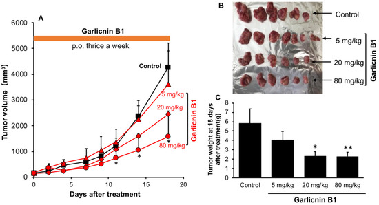 Anti-tumor effect of garlicnin B1 against mouse sarcoma S180 solid tumor. Garlicnin B1 treatment was initiated on day 7 after S180 tumor cell inoculation when tumors had grown to 7–8 mm in diameter. (A) shows the changes in tumor volume during the experiment, (B) shows representative pictures of tumors collected on day 18 after garlicnin B1 treatment, and (C) shows the average tumor weight of collected tumors. Data are presented as means ± standard deviation (SD); n = 4–8. * p < 0.05; ** p < 0.01 versus the untreated control group. See text for details.