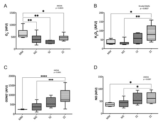 Significant differences in the oxidative stress status assessed by the O2− (p = 0.002), H2O2 (p = 0.002), ONOO− (p < 0.0001), and the NO (p = 0.028) levels were observed between groups (Figure 1). When compared to the control group, the ZZ patients showed significantly higher levels of H2O2 (p = 0.031), ONOO− (p < 0–0001), and NO (p = 0.014) and decreased O2− levels (p = 0.044). The MZ and the SZ patients also showed significantly lower levels of O2− levels than the control group (p = 0.009 and p = 0.003, respectively). No significant differences in H2O2 (p > 0.999 and p > 0.999), ONOO− (p = 0.623 and p = 0.136), and NO (p = 0.944 and p = 0.544) levels were observed between the control group and the MZ and the SZ groups. When patients’ groups were compared to each other, significant differences were observed in MZ vs. ZZ H2O2 (p = 0.003), ONNO− (p = 0.0002), and NO (p = 0.041) levels.