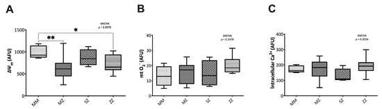 Significant differences were observed in the mitochondrial membrane potential (∆ψm) (p = 0.007). Compared to the control group, the MZ and the ZZ patients showed significantly decreased ∆ψm (p = 0.004 and p = 0.037, respectively). SZ patients also had lower ∆ψm than the control group, although the differences did not reach statistical significance (p = 0.9922). No significant differences in ∆ψm were observed when patient groups were compared to each other (Figure 2A). No significant differences were observed in the mitochondrial O2− between groups (p = 0.1978) (Figure 2B).