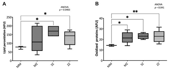 Similarly, compared to the control group, the MZ, SZ, and ZZ patients showed significantly increased levels of oxidized proteins (p = 0.019, p = 0.023, and p = 0.005, respectively). No significant differences were observed when patients’ groups were compared to each other (Figure 3B).