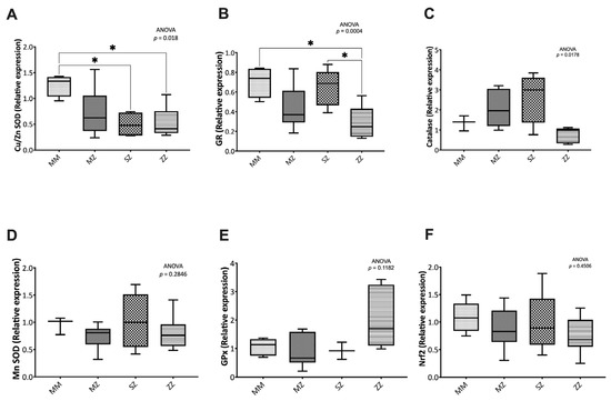 Significantly decreased Cu/Zn SOD and GR levels were observed between groups (p = 0.018 and p = 0.004, respectively) (Figure 4). Compared to the control group, the MZ, SZ, and ZZ patients showed significantly decreased levels of Cu/Zn (p = 0.1211, p = 0.013, and p = 0.014, respectively). When patients’ groups were compared to each other, no significant differences were observed (Figure 4A).