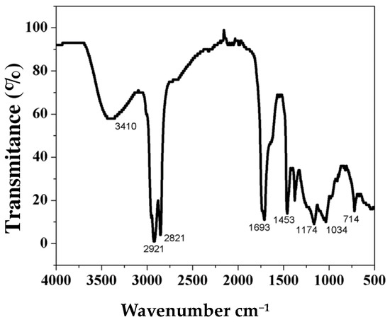 The FTIR-ATR spectra of CEP are shown in Figure 1 with characteristic signals of the aromatic compounds. A broad band at 3410 cm−1 was attributed to the stretching vibration of the O-H group, and the bands at 2921 and 2821 cm−1 were due to C-H stretching. In addition, signals specific to aromatic rings were observed, such as the band at 1693 cm−1 corresponding to C=C stretching, the signal at 1453 cm−1 is due to C-C stretching and, finally, the signal at 1034 cm−1 is attributed to C-O stretching. All these bands show the presence of polyphenols in the extract obtained [29,30,31].