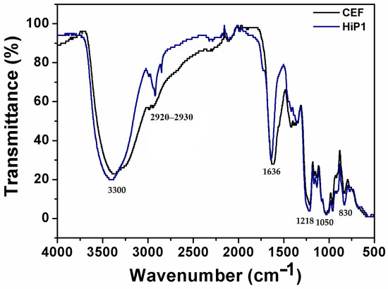In contrast, FTIR-ATR spectra of the CEF and HiP1 are shown in Figure 2. All the spectroscopic patterns were similar, with characteristic signals of the sulfated polysaccharides. A broad band corresponding to the O-H extension vibration between 3600 and 3000 cm−1 characteristic of the hydroxyl group appears. Symmetric and asymmetric extension of the sp3 hybridized carbon–hydrogen (C-H) bonds is observed with a weak band between 2920 and 2930 cm−1 [32,33,34]. A strong vibrational band was observed between 1100 and 1000 cm−1, corresponding to the C-OH bond, as well as the characteristic vibrational bands of the C-O-C glycosidic bonds. In addition, the absorption bands at 1218 cm−1, (S=O group) and at 830 cm−1 (C-O-S bond) allowed us to determine the presence of the sulfate group. Finally, the presence of the carboxyl groups in the acid sugars was identified by the absorption band at 1636 cm−1 [35,36,37].