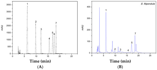 HPLC profile of monosaccharide standards (A) and hydrolyzed polysaccharide crude extract from S. filipendula (B). 1: PMP. 2: Mannose. 3: Glucuronic acid. 4: Glucose. 5: Galactose. 6: Arabinose. 7: Fucose.