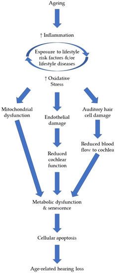 Oxidative stress and inflammation can also cause damage to the endothelium [15]. Maintaining the health of the endothelium is important for successful ageing as it is responsible for releasing enzymes and/or nitric oxide to maintain vascular tone, control platelet adhesion, blood clotting, and vascular proliferation [15,21]. Oxidative damage to the endothelial cells of the stria vascularis due to poor vascular health, has also been linked to the pathophysiology of ARHL [14]. The stria vascularis is a structure within the cochlea that has a critical role in hearing and cochlear amplification [23]. In addition to ageing and poor vascular health, oxidative stress can be induced by the presence of other health comorbidities (e.g., obesity, diabetes), environmental (e.g., noise and ototoxic chemical exposure), and genetic factors [15].